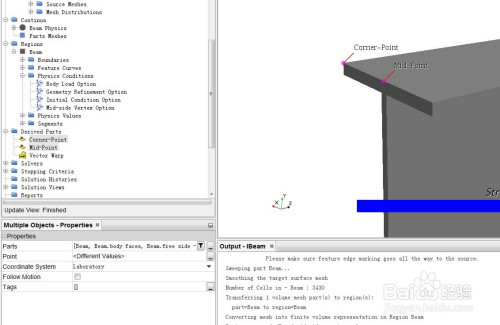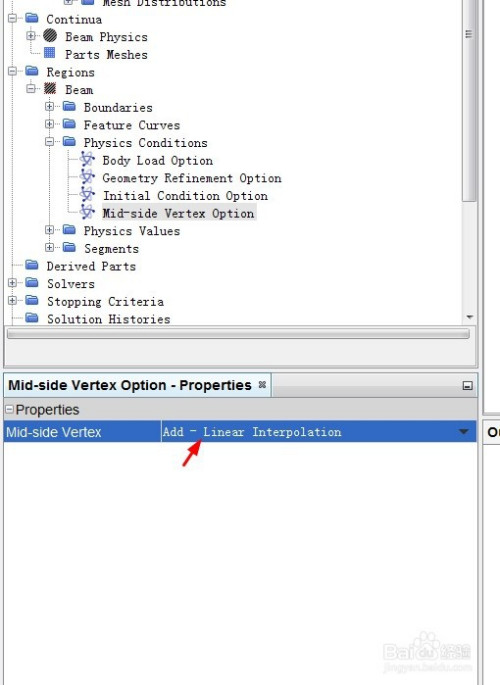 这里的六面体网格共有8个节点,可以经由过程增添边中节点提高计较精度。睁开Regions > Beam > Physics Conditions > Mid-side Vertex Option,Mid-side Vertex选择Add - Linear Interpolation,这样每条边的中间增添一个节点,一个单位共计20个节点。