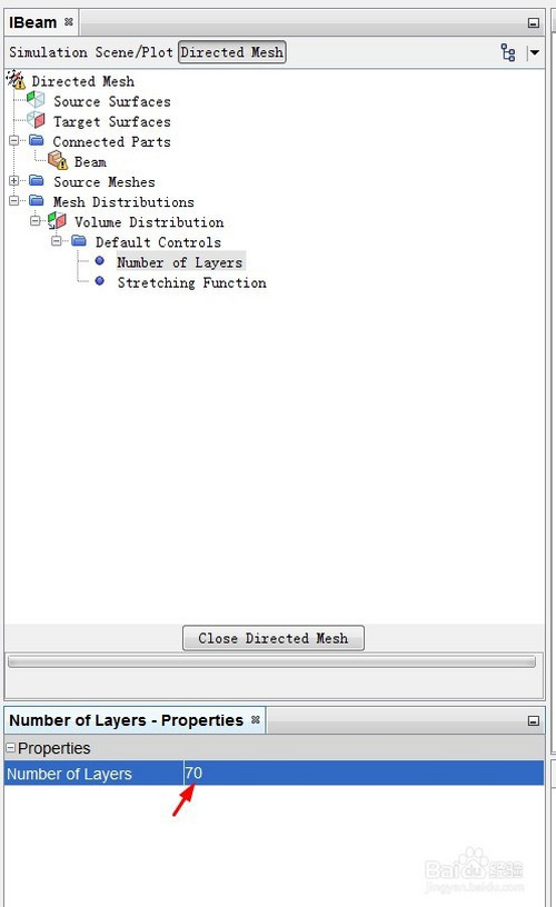 睁开Mesh Distributions > Volume Distribution > Default Controls > Number of Layers,设为70,点击Close Directed Mesh。