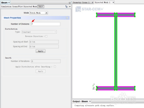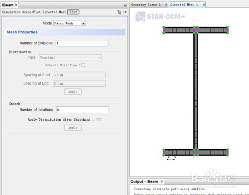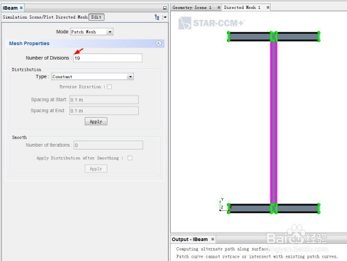 将Mode改为Patch Mesh。选择沿Flange length偏向的特征线,Number of Divisions设为7。选择沿Beam height偏向的特征线,Number of Divisions设为19。残剩特征线的Number of Divisions设为1。完当作后封闭编纂窗口。