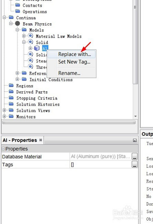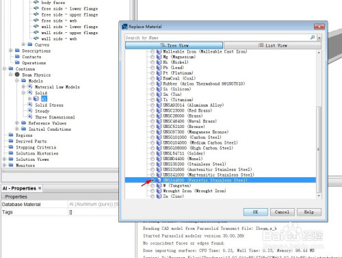 睁开Beam Physics > Models > Solid > Al,右键Replace with,选择UNSS44600 (Ferretic Stainless Steel)。