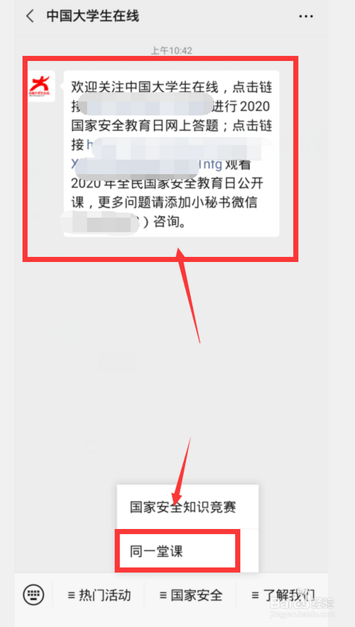 第四:进入公家号点击【平安课】链接或者点击【国度平安-统一堂课】。