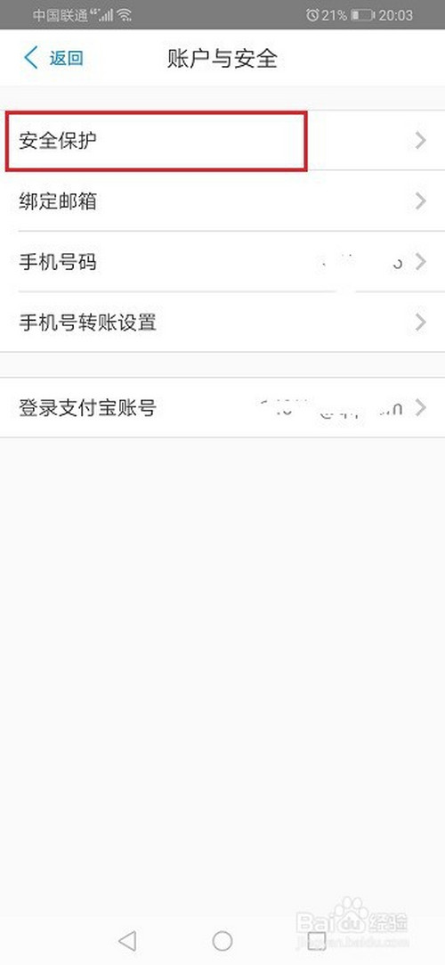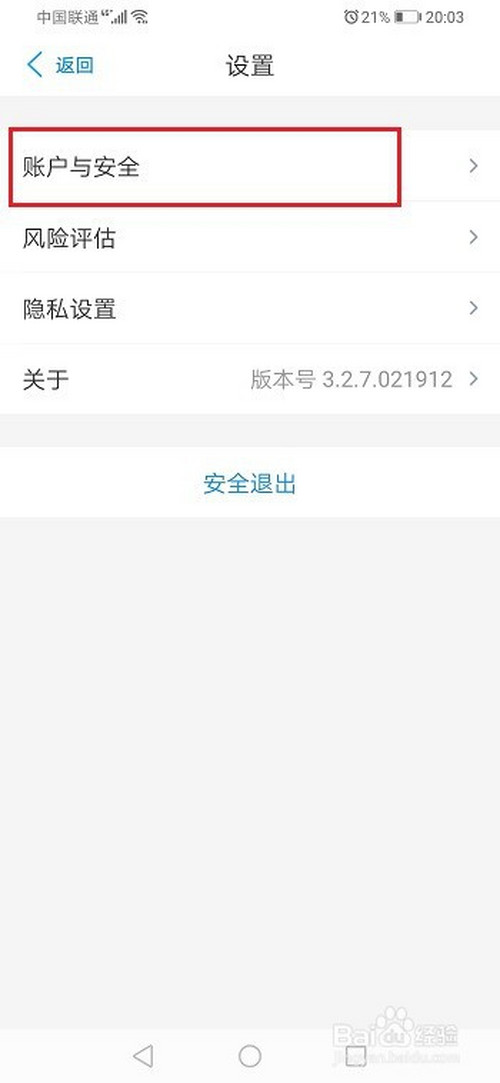 第二步进去之后,点击设置,选择账户与平安,如下图所示: