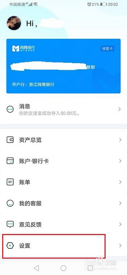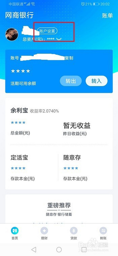 第一步手机打开网商银行,进去首页,点击账户设置,如下图所示: