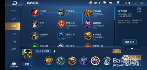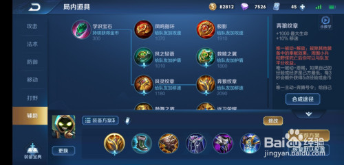 第一件装备,学时宝石,前期不进级,中后期在进级为笨狼纹章,增添血量、移速,本家儿动技术给本身和队友供给移动速度。