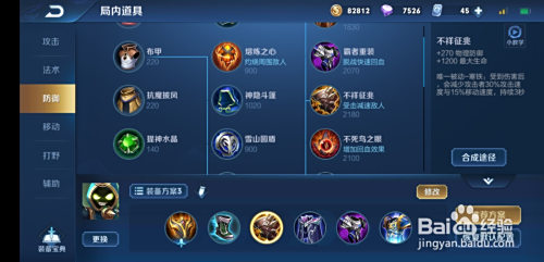 第三件装备,不祥征兆,增添血量、物防,被动降低攻速。可禁止弓手、露娜等攻速英雄。
