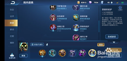 第一件装备,学时宝石,前期不进级,中后期在进级为笨狼纹章,增添血量、移速,本家儿动技术给本身和队友供给移动速度。
