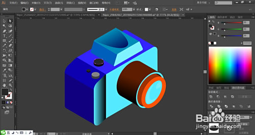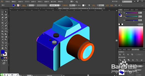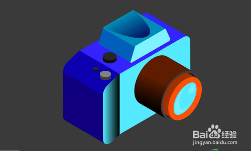 利用三种分歧的深蓝色别离填充拍照机的左侧面、侧面与顶端,让色调从深到浅进行转变。