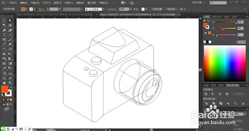 利用钢笔画出拍照机的根基布局,包罗拍照机的顶端、巨细按纽、前面的镜头布局件的细节,还有拍照机前面的镜片的路径。再画出拍照机的左侧面与右侧面的细节路径。