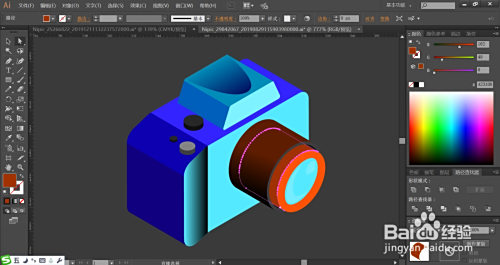 利用明暗两种红棕色填充拍照机正面的圆筒镜头的侧面与顶端的路径,圆筒的正面用纯蓝色填充。