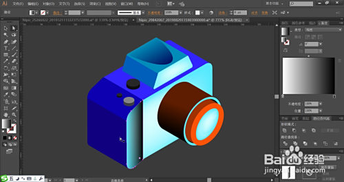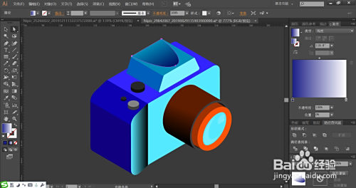 最后,我们用正片叠底的蓝色渐变填充拍照机的顶端暗光区域,再用正片叠底的灰色渐变填充拍照机的正面左侧暗光区域,拍照机上面的按钮用分歧明度的黑色与白色别离填充,完当作拍照机图片设计。