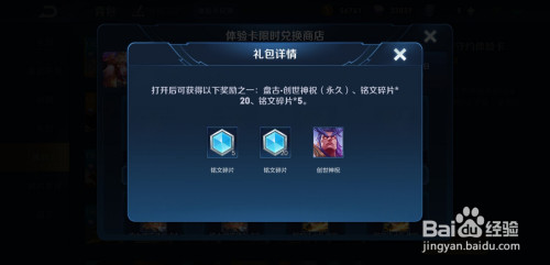 接下来,我们看1日体验卡【惊喜礼包】。里面有盘古-创宿世神祝(永远)皮肤。