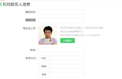 填写机构联系人信息,包含真实姓名,身份证号和联系信息等。