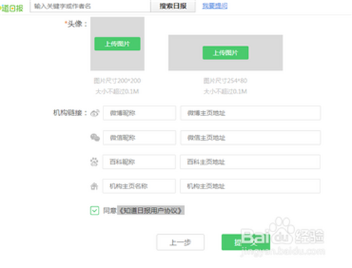 填写展示信息,包含名称,简介,头像和机构链接,勾选赞成《知道日报用户和谈》后提交。