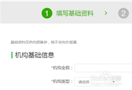 进入申请页面,填写机构根本信息,包含机构全称和组织机构代码证上传等。
