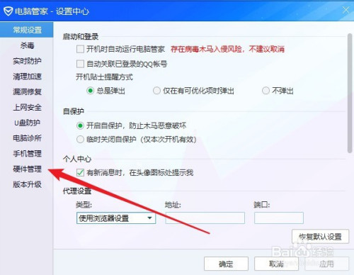然后再打开到设置中间页面,点击硬件办理菜单项。
