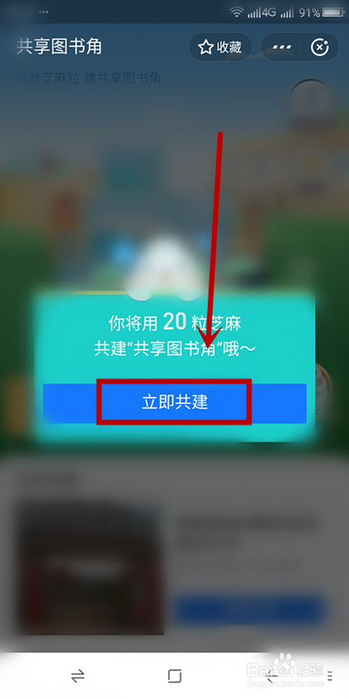 7、在【共享图书角】页面,单击【进献20芝麻粒】