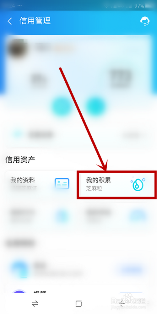 5、在【信用办理】页面下部,单击【信用资产】选项组下的【我的堆集 芝麻粒】