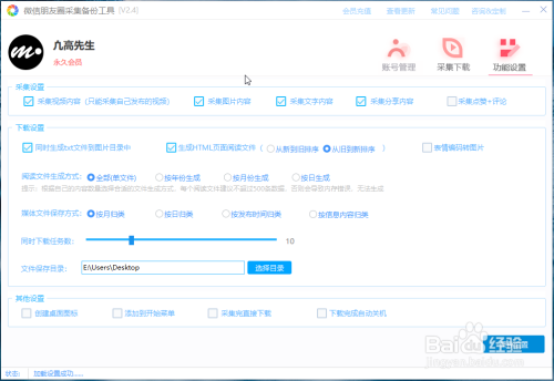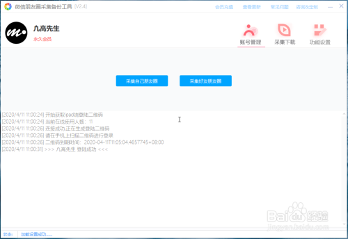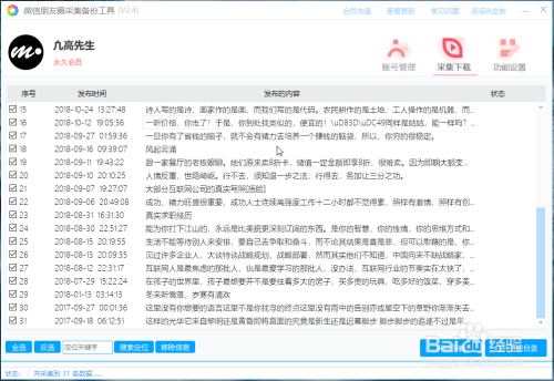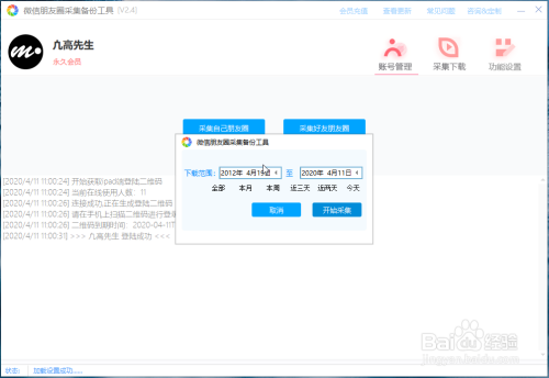 登岸后,界面上只有两个按钮,点击采集本身伴侣圈,会弹出日期规模设置,若是想采集全数,直接点击确定就可以,软件顿时起头采集,这时会转到采集下载页,可以在软件上直不雅的看到每条信息正在加载到列表中。