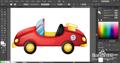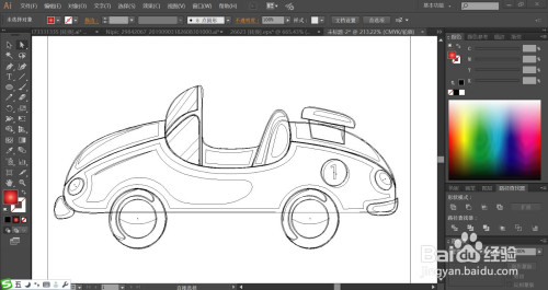 利用钢笔东西画出车身的根基路径,重点绘制前后车灯与车座的细节,再绘制出车窗的明暗光线路径,利用圆形东西画出车轮的表里细节路径,利用钢笔绘制出车轮上面的暗光与亮光路径。