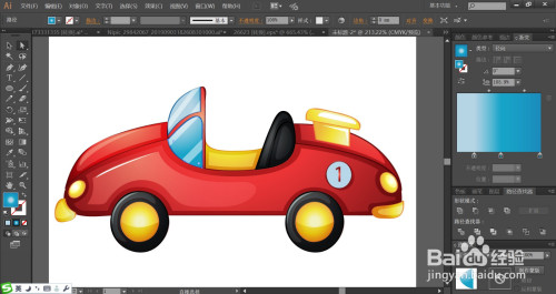 利用滤色模式的红色渐变填充车身的高光路径,在极亮的处所用白色填充。车身的标牌用天蓝色填充,数字用红色的渐变填充。