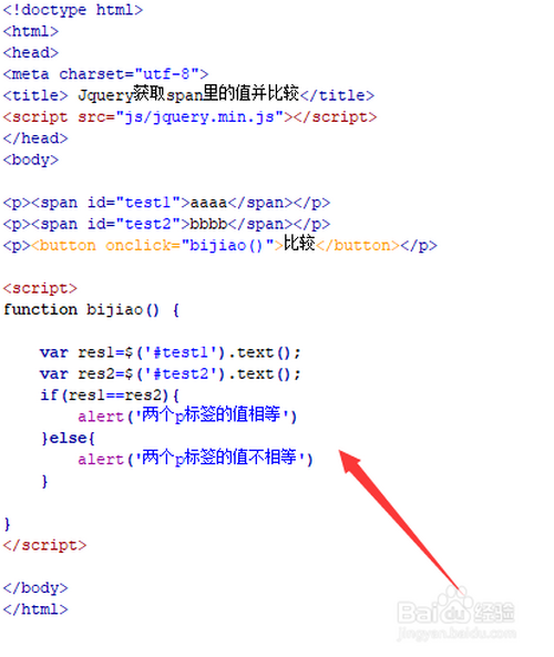 2、在js中,别离经由过程id获得span标签对象,再利用text()方式获得span的值,然后利用if语句对两个span值进行比力。