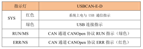 在USBCAN-E-D工业级CAN接口卡的侧面挡板上有三个双色LED指示灯,用于别离指示系统的运行状况和和谈运行状况,此中各个指示灯各颜色在和谈板卡中所代表界说如下。