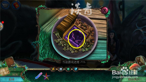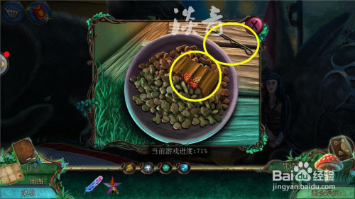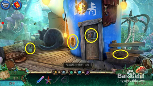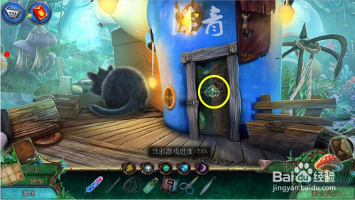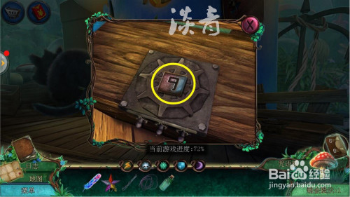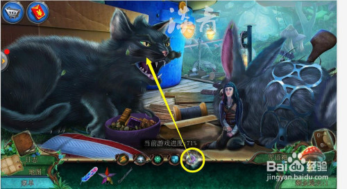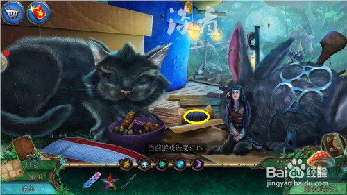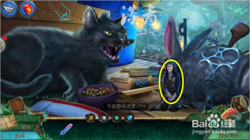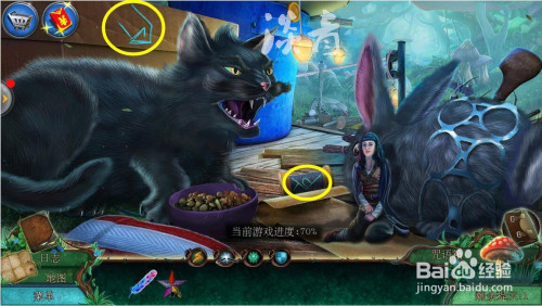 点击猫旁边的【猫粮碗】,把箱子从猫粮里拿出来,再用旁边的束发夹撬开箱子,收集里面的【咒语符号】,并拿到【束发夹】。