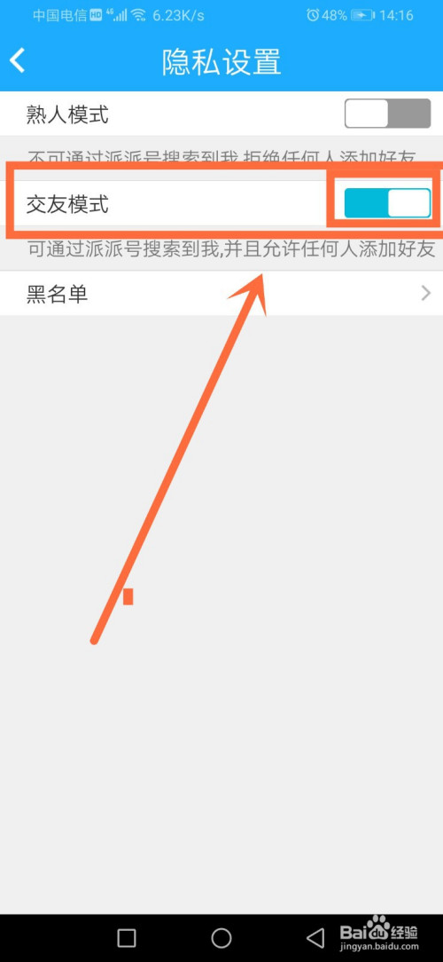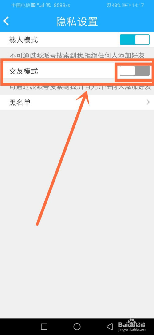 进入隐私设置界面后,点击【结交模式】后面的【封闭按钮】进入。如下图所示