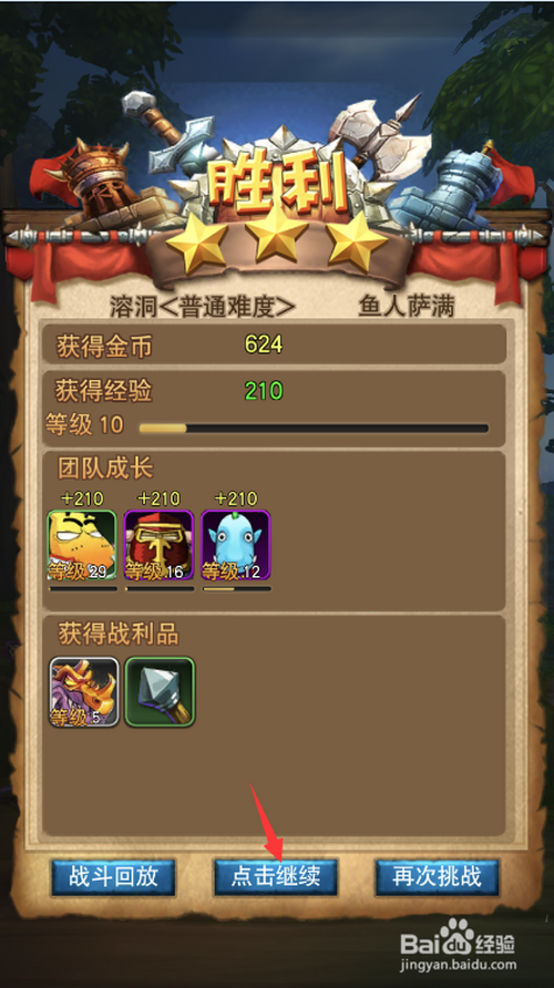 6.通关奖励210点卡牌和团队经验,失落落一个野怪卡牌和一把绿色兵器。点击下方点击继续即可分开副本。