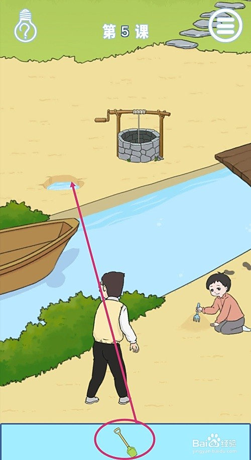 然后,把【铲子】拖动到河对岸的小水坑那儿。