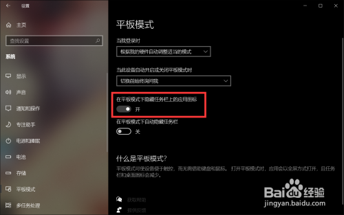 最后,在平板模式界面中,我们可以找到“在平板模式下埋没使命栏上的应用图标”的开关,将开关打开即可将应用图标埋没。