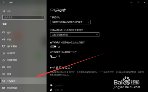进入系统设置界面今后,我们在左侧的菜单栏中找到“平板模式”选项卡,并点击进入选项卡界面。