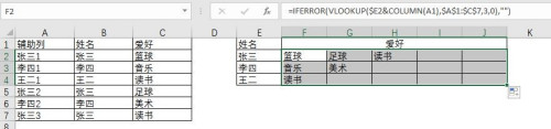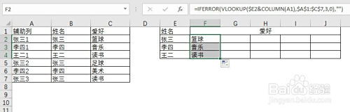 =IFERROR(VLOOKUP($E2&COLUMN(A1),$A$1:$C$7,3,0),"")