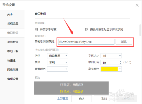 进入“窗口歌词”页面后,在“窗口歌词”歌词保留下直接在“便宜歌词保留到”右侧的文本框中进行点窜(或点击“浏览”进行点窜)。见下图