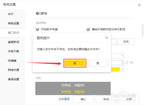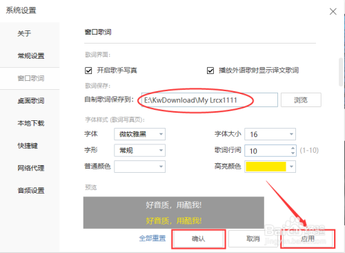 当歌词保留位置确定后,点击右下角“应用”即可(或点击“确定”直接退出界面)。见下图