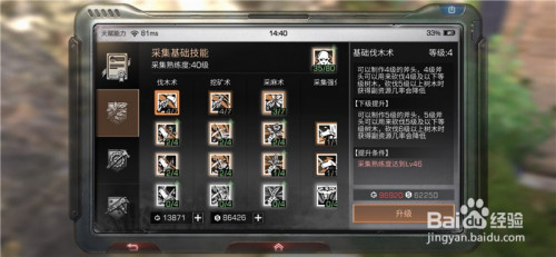 我们要采集什么,就要对应的进级到指定品级,好比要求4级,我们就需要把这两个技术别离晋升到4级。