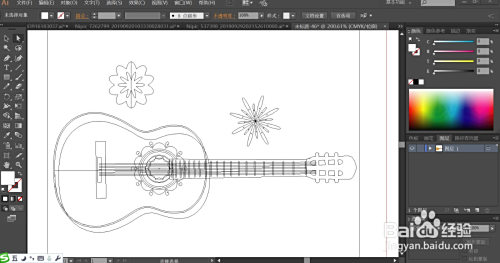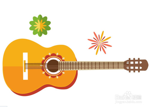 利用钢笔绘制出吉它的大音箱,再绘制出它的琴弦,继续绘制吉它的手柄与顶端的细节路径,最后,我们用圆形绘制出吉它上方的两个花朵图案。