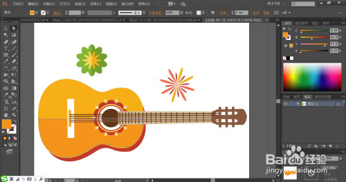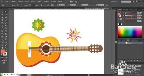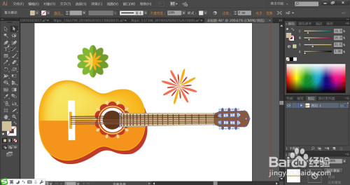 利用暗绿色与橙红色搭配填充花朵的右侧,再用浅绿色与橙色填充花朵的左侧,左侧亮右侧暗,完当作木吉它图片设计。
