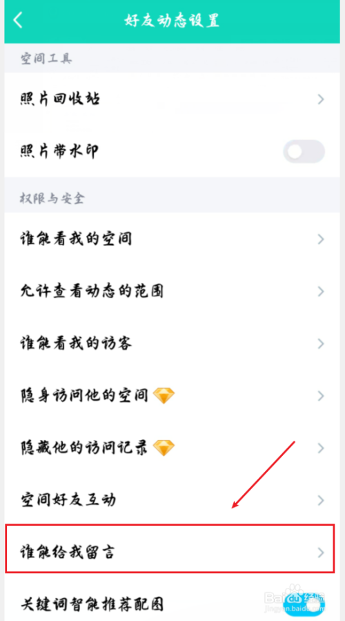 接着找到“谁能给我留言”这个选项,点击即可进入设置。
