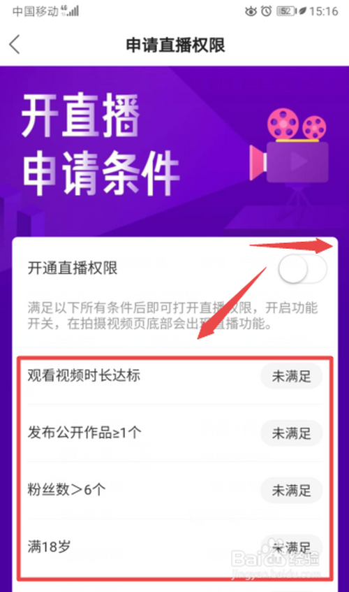 5、可以看到需要有这些权限后才可以开通,有权限后,之后直接将开通直播权限的滑动按钮标的目的右滑动打开即可。