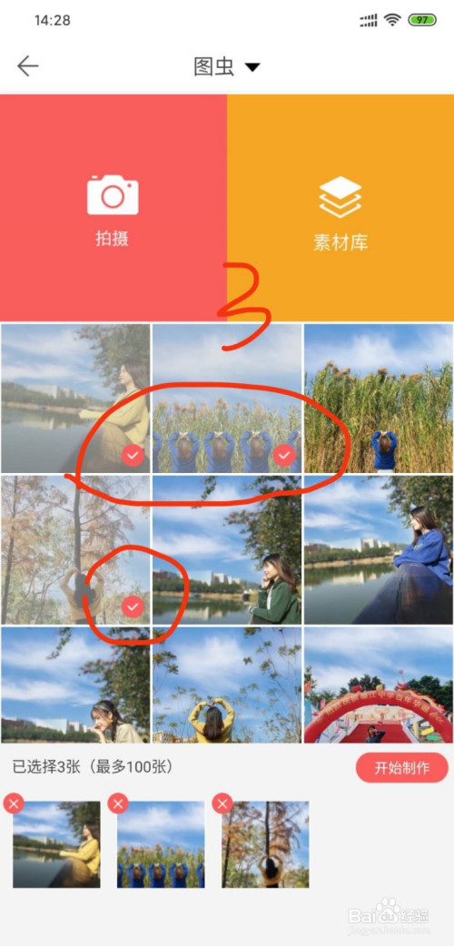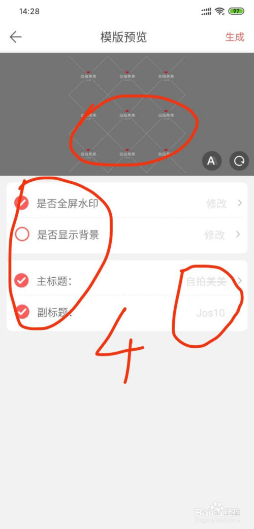4、勾选完图片,点击“起头建造”,接下,就可以鄙人面点击“水印”或者“文字”,都是有模板的。小编选择的是“水印”,如下图(水印有良多种格式,可以选择适合您本身的)