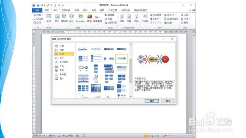 点击插入选项卡——插图组——SmartArt按钮。在跳出的对话框架中选择分阶段流程图。