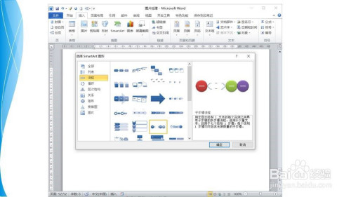 点击插入选项卡——插图组——SmartArt按钮。在跳出的对话框架中选择子步调流程图。