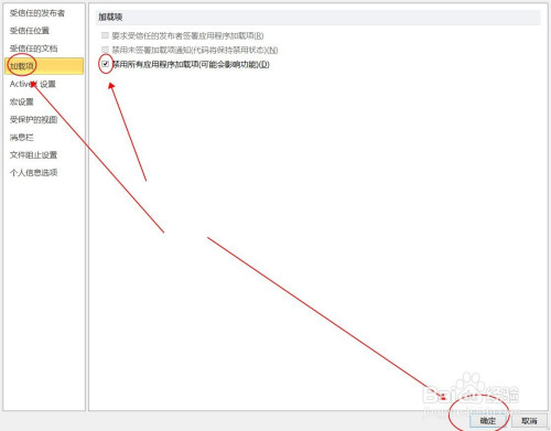 打开“信赖中间”菜单,点击“加载项”,在右边勾选“禁用所有应用程序加载项(可能会影响功能)(D)”后,点击右下角简直定。撤退退却出。