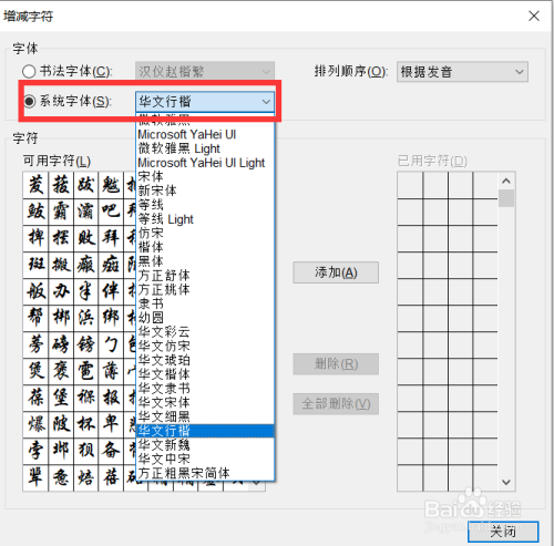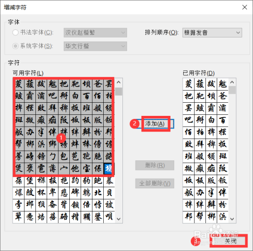 3. 选择字体类型,接着选择文字,点击“添加”,最后点击“封闭”