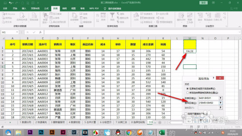 5.然后打开高级筛选对话框,注重前提区域必需连空白的单位格都要框选住,这是格局问题。