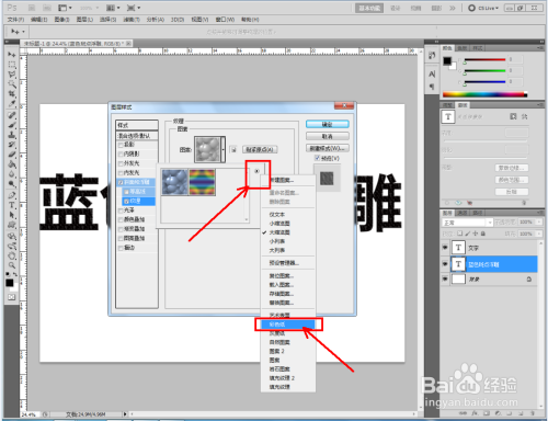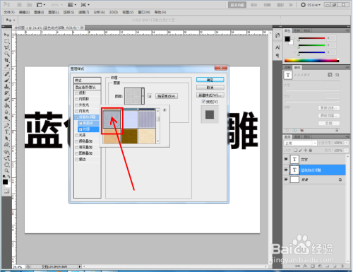 双击图示文字图层,弹出图层样式设置栏。勾选【斜面和浮雕】-【纹理】,点击图示小三角,弹出图案选项栏;