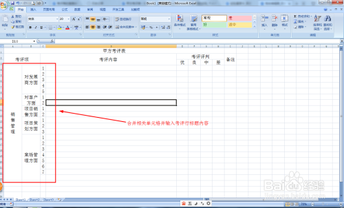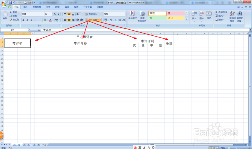 接着归并A2:B3、C2:D3、E2:H2、I2:I3——然后按下图所示输入考评列题目。