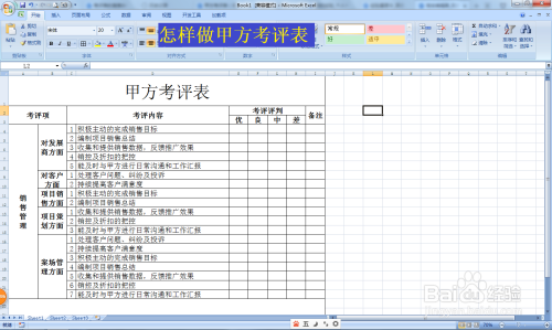 选择A3:A22并点击归并后居中,同样方式在B列归并相关项目考评的行题目并输入内容——在C列输入各考评类的序号。