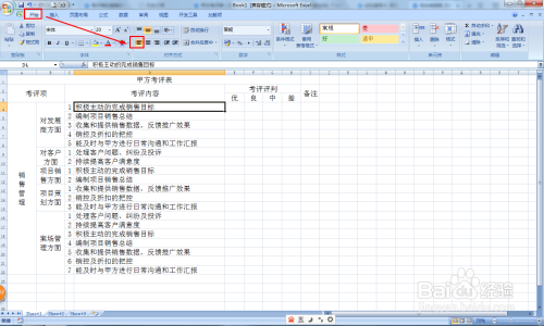接着在D列那边输入各个考评类的具体要求——点击起头——选择左对齐。